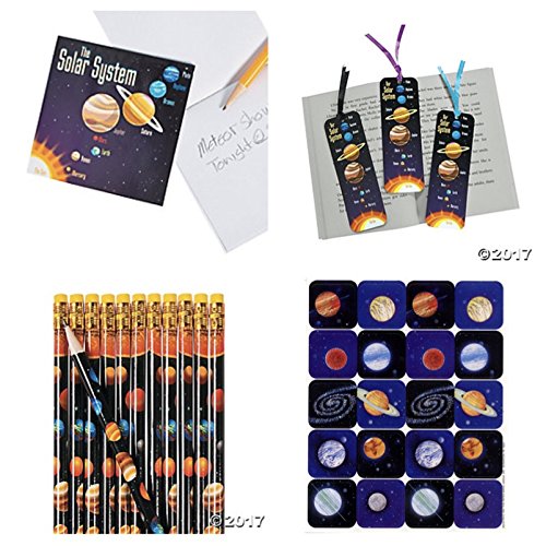 -. Feature : 56 Fun SPACE Themed Party Favors / 12 Mini 4" Solar System Notepads with 30 blank pages / 12 Solar System Pencils 7.5" with eraser top and #2 lead / 12 Solar System Laminated BOOKMARKS 2" X 6" - Also includes one sheet of 20 PLANET Stickers 1" / Great Rewards for Teachers, doctor's office, dentist, daycare