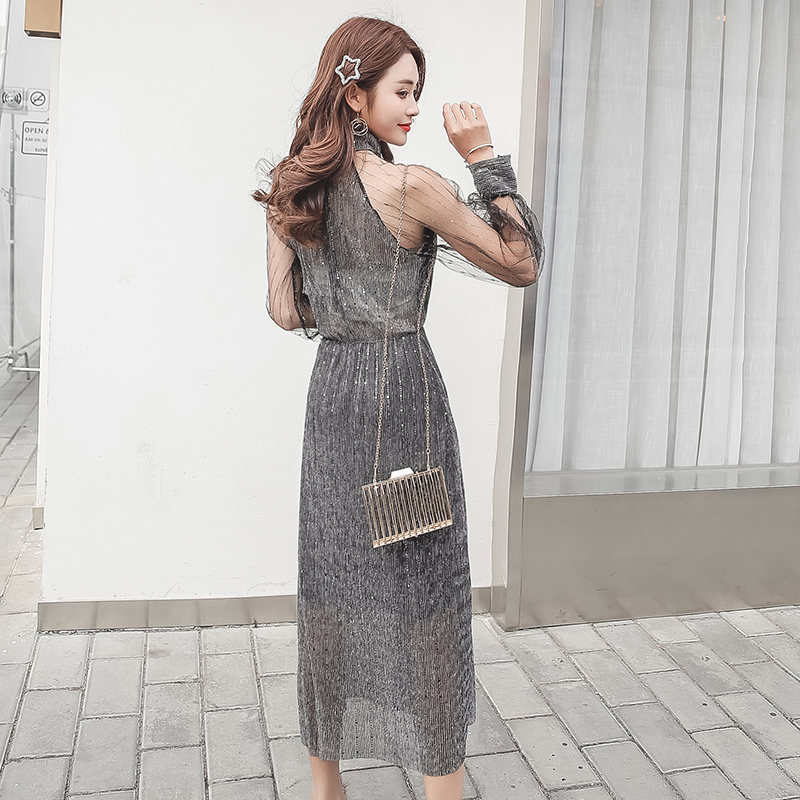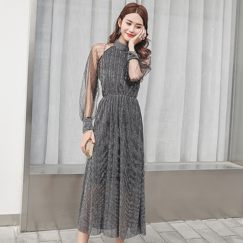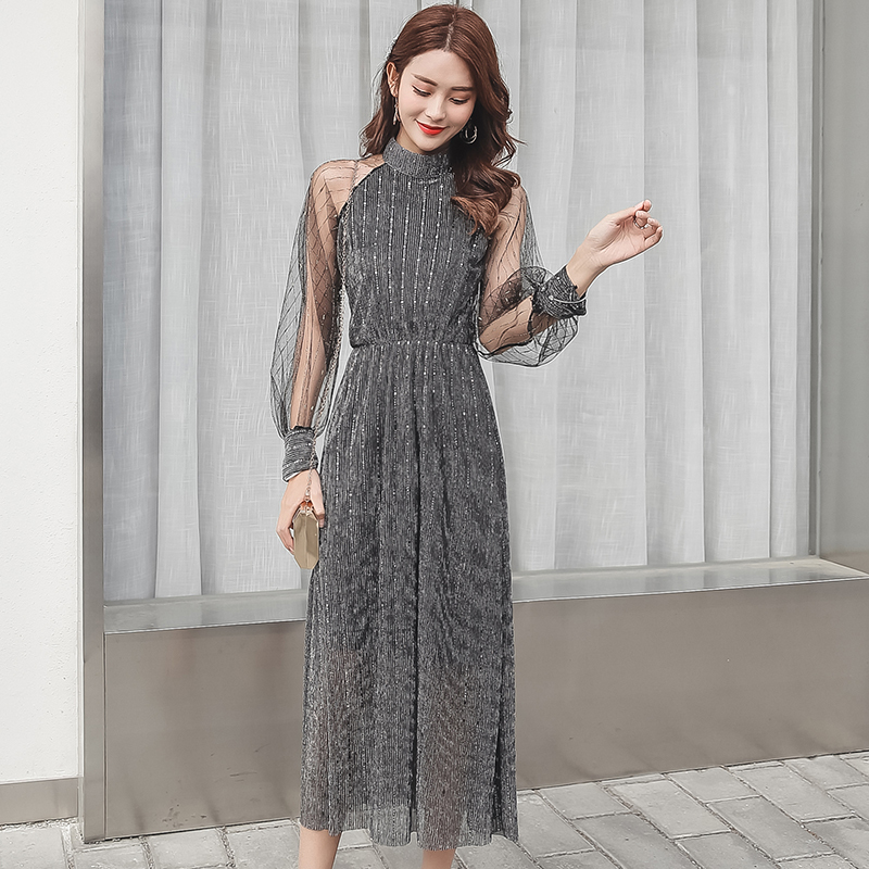 ワンピース 長袖 シースルー ホルターネック ミモレ丈 フレア ストライプ