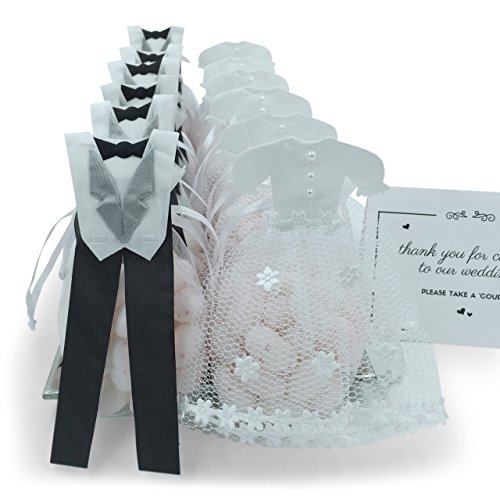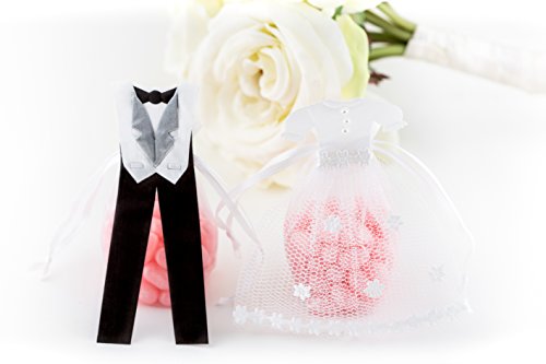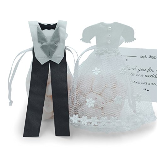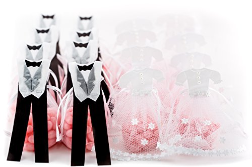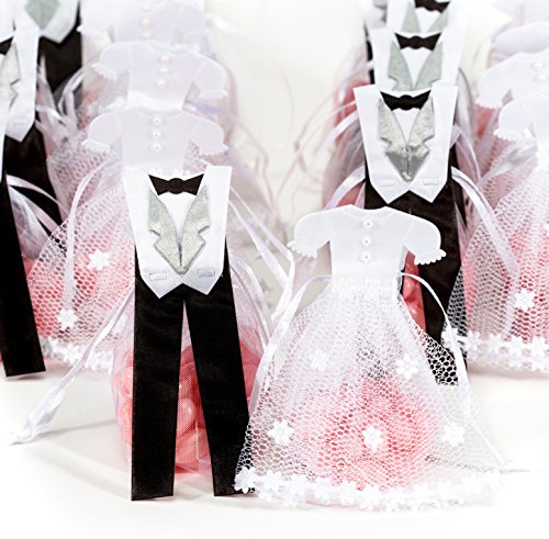 - ✿ EXQUISITE DETAIL: Our organza bags feature gorgeous attention to detail, such as a white satin bodice and tulle skirt for the bride and a white satin tuxedo with bow tie for the groom.
