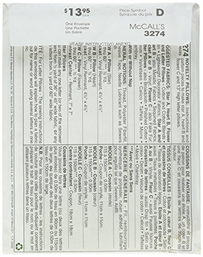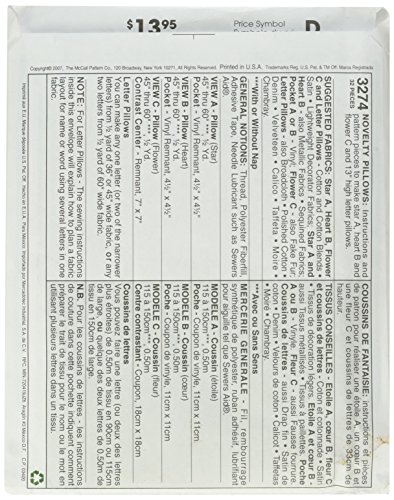 -. Binding : Kitchen -. Brand : McCall's Patterns -. EAN : 0023795327411 -. Feature : One Size Only / Includes pattern pieces and sewing instructions / Made by McCall's Patterns / Copyright 2011 / P.R.Inted in the USA -. IsAutographed : 0 -. Label : McCall Pattern Company -. Manufacturer : McCall Pattern Company -. Model : M3274OSZ -. MPN : M3274OSZ -. PackageQuantity : 1 -. PartNumber : M3274OSZ -. ProductGroup : Art and Craft Supply -. ProductTypeName : HOME -. Publisher : McCall Pattern Company -. Size : One Size Only -. Studio : McCall Pattern Company -. Title : McCall's Patterns M3274 Novelty Pillows, One Size Only -. UPC : 023795327411