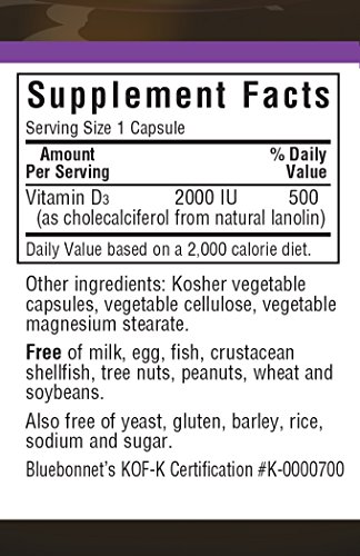 -. Binding : Health and Beauty -. Brand : Blue Bonnet -. EAN : 0743715003156 -. Feature : Natural Lanolin Source / Easy-to-swallow vegetable capsules for maximum assimilation and absorption. / Provide 100% natural vitamin D3 -. Label : Bluebonnet -. LegalDisclaimer : These statements have not been evaluated by the FDA. This product is not intended to diagnose, treat, cure, or prevent any disease. -. Manufacturer : Bluebonnet -. Model : No Model -. MPN : No MPN -. NumberOfItems : 180 -. PackageQuantity : 1 -. PartNumber : No MPN -. ProductGroup : Health and Beauty -. ProductTypeName : HEALTH_PERSONAL_CARE -. Publisher : Bluebonnet -. Studio : Bluebonnet -. Title : Vitamin D3 2000 IU - 180 Vegetarian Capsules -. UPC : 743715003156