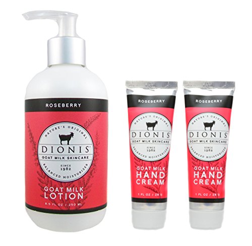 - Three item set that includes one 8.5-ounce Dionis Goat Milk Body Lotion and two 1-ounce tubes of Goat Milk Hand Cream in "Roseberry" scent.
