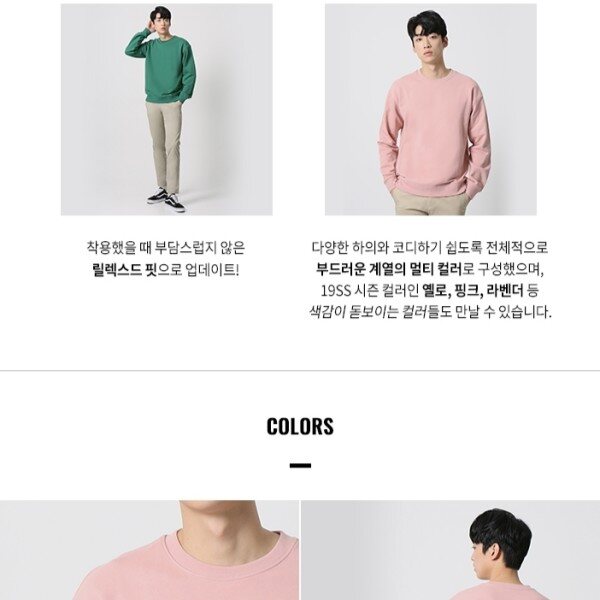 착용했을때 부담스럽지 않은 릴렉스드핏 다양한 하의와 코디하기쉽도록 전체적으로 부드러운 계열의 멀티컬러로 구성했으며 19S/S 시즌컬러인 옐로,핑크,라벤더등 색감있는 컬러들도 만날수있습니다