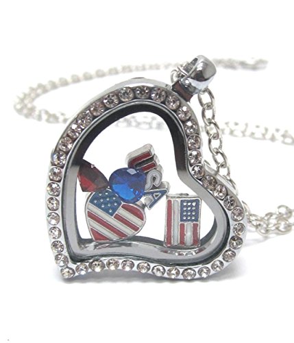 USA Crystal Locket Necklace Mini Floating Charms Flag Heart Silver Tone