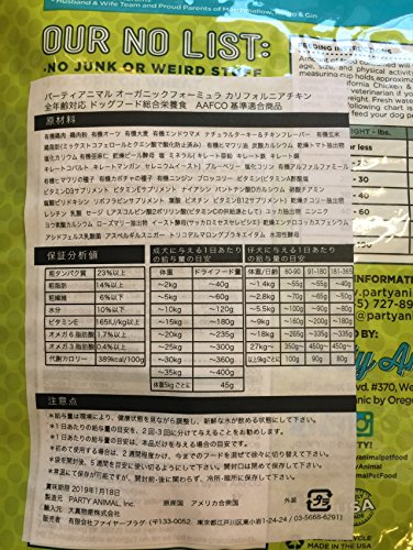 原材料:有機鶏肉、チキンミール、有機オーツ、有機大麦、有機エンドウマメ、ナチュラルターキー&チキンフレーバー鶏脂肪(ミックストコフェロールとクエン酸で酸化防止済)、有機玄米、有機亜麻仁、炭酸カルシウム、トマト抽出物、有機ひまわり油、塩化カリウム、乾燥ビール酵母、塩、ミネラル(キレート亜鉛、キレート鉄、キレート銅、キレートコバルト、キレートマンガン、セレニウムイースト)、ブルーベリー、塩化コリン、有機アルファルファミール、有機ひまわりの種子、有機かぼちゃの種子、有機にんじん、ブロッコリー、ビタミン(ビタミンA酢酸塩、ビタミンD3サプリメント、ビタミンEサプリメント、ナイアシン、バントテン酸カルシウム、塩酸ピリドキシン、リボフラビンサプリメント、葉酸、ピオチン、ビタミンB12サプリメント)チコリー抽出物、レシチン、乳酸、セージ、Lアスコルピン酸2ポリリン酸(ビタミンCの供給源として)、ユッカ抽出物、ニンニク、ヨウ素酸カルシウム、ローズマリー抽出物他