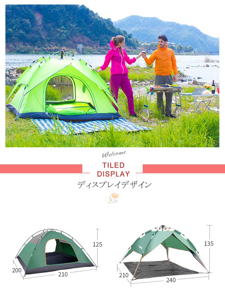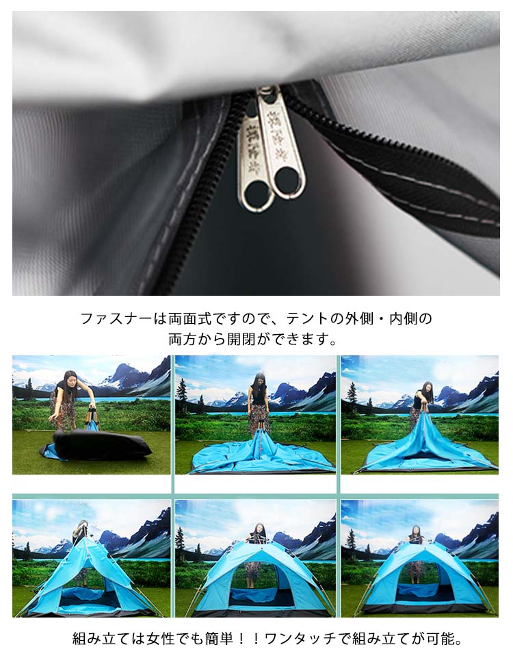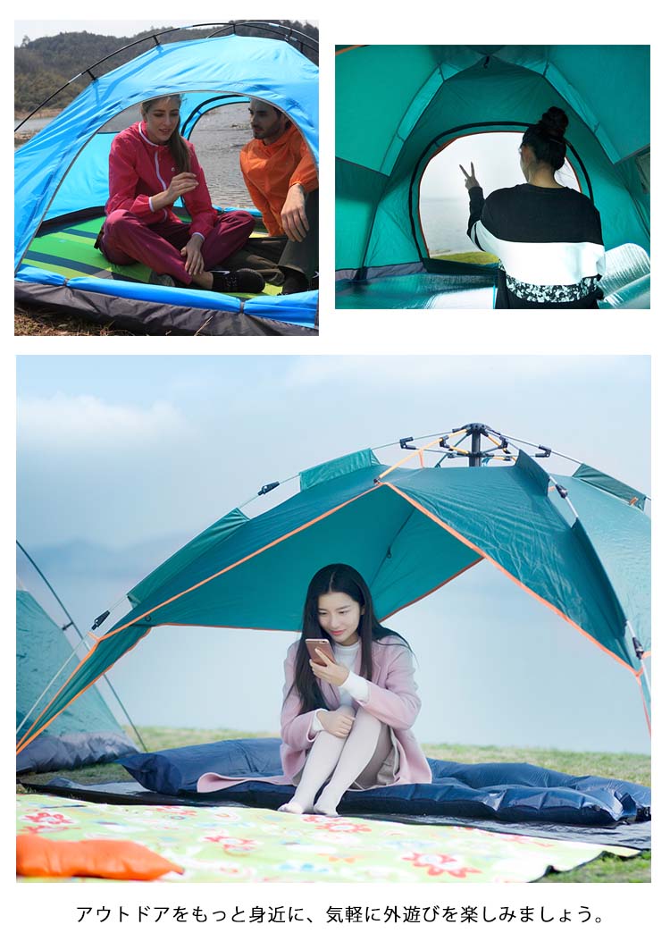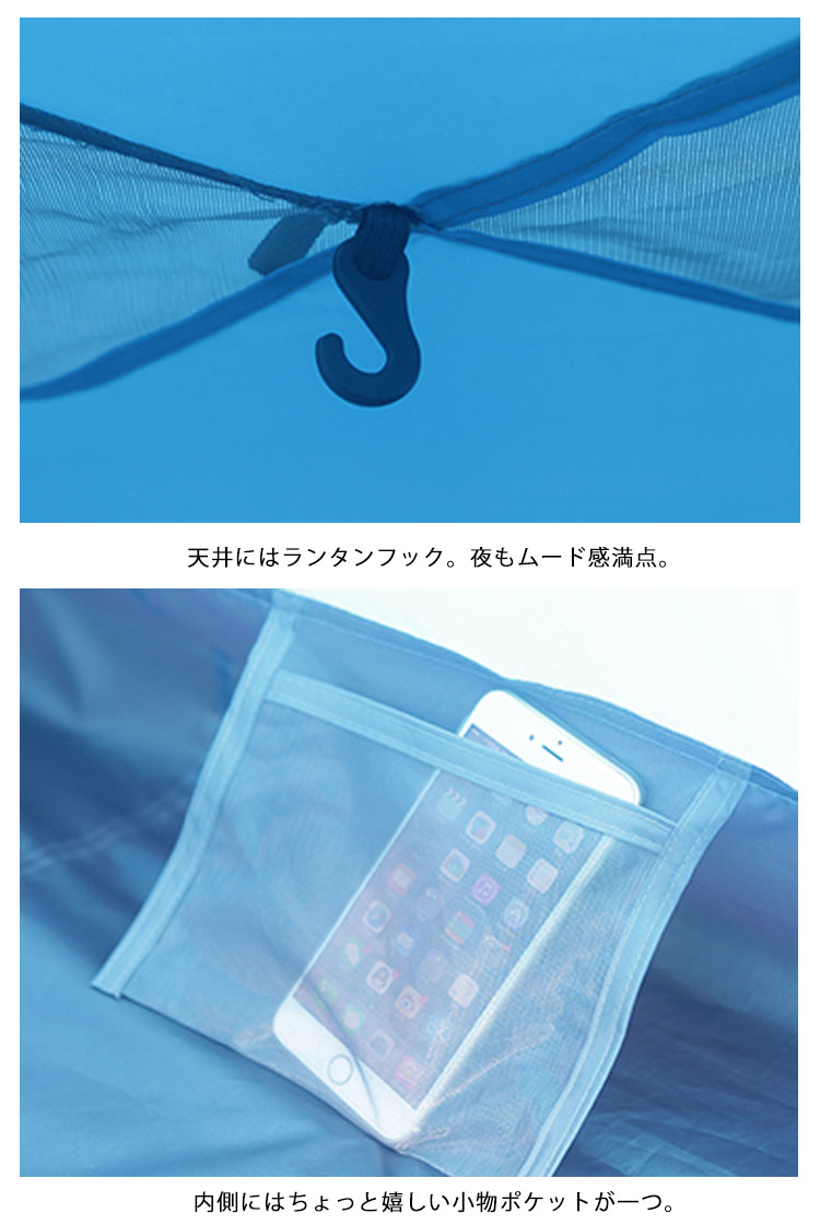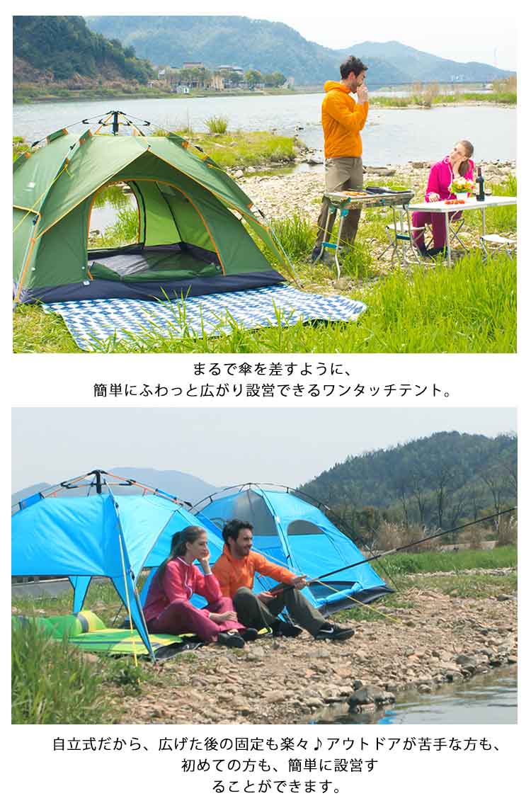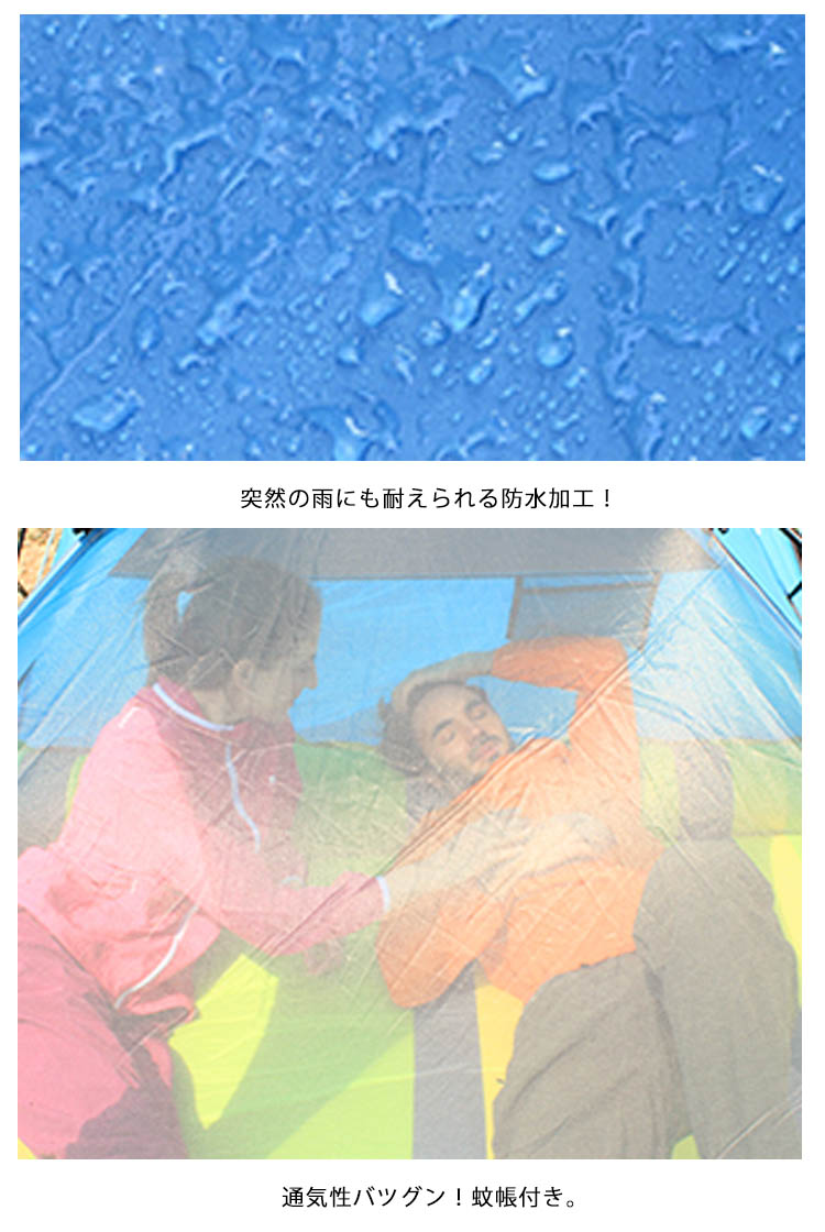 | ワンタッチで開くから、初めてでも簡単!まるで傘を差すように、簡単にふわっと広がり設営できるワンタッチテント。自立式だから、広げた後の固定も楽々♪アウトドアが苦手な方も、初めての方も、簡単に設営することができます。アウトドアをもっと身近に、気軽に外遊びを楽しみましょう。青空の下だと、いつもよりもっと楽しく仲良くなれます♪ | |