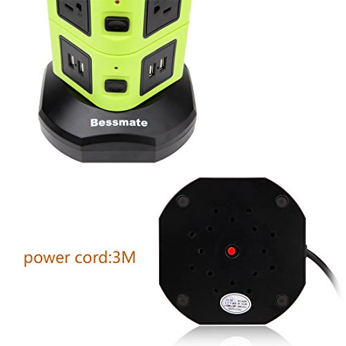 Bessmate Tower Power Strip Smart outlet 10-Outlet Surge Protector with 4 USB Port Charging Station Tower 9.8ft Extension Cord Green