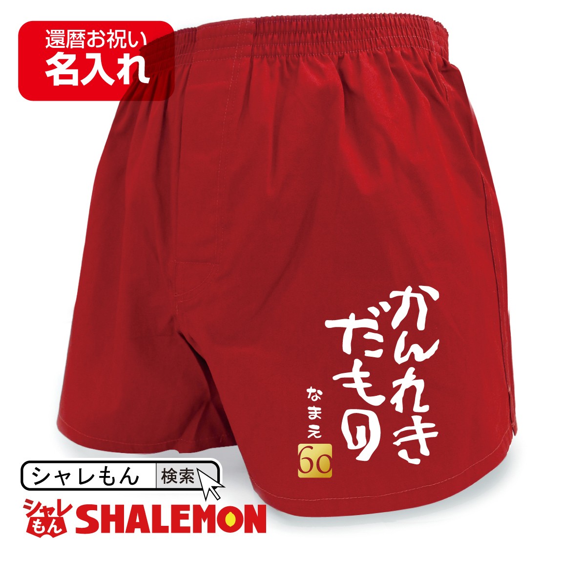 還暦祝い 男性用 トランクス 下着 赤い 還暦パンツです。実用性ある還暦祝いです。赤いトランクスにかんれきだものとプリントされ、豪華金文字で60歳の落款印が入っています。ご本人・ニックネームの名入れも可能です。 名入れはひらがなの文字がデザインにあっていてGood! 名入れ文字は漢字の指定も可能ですが、毛筆体に変換されます。 実用性ある還暦祝いです。