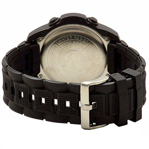 -. Feature : 49mm round, matte black resin case with 4 silver-tone accent screws / Black resin dial with silver-tone markings / Textured black resin strap with stainless steel buckle closure / Digital module with reverse LCD display - Black background with light grey digits; functions include hour, minute, second time keeping, alarm, chronograph, lap time, second time zone and military time / Water resistant to 330 feet (100 M): suitable for snorkeling, as well as swimming, but not diving