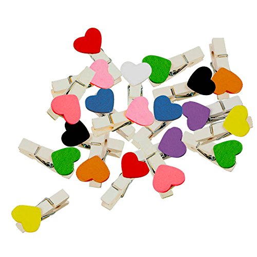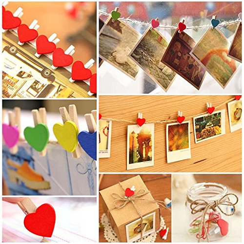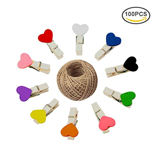 100 Pcs Mini Colored Wooden Heart Clothespins 3.5cm Photo Craft Clips For Wedding Party Decor with 100 Feet Jute Twine