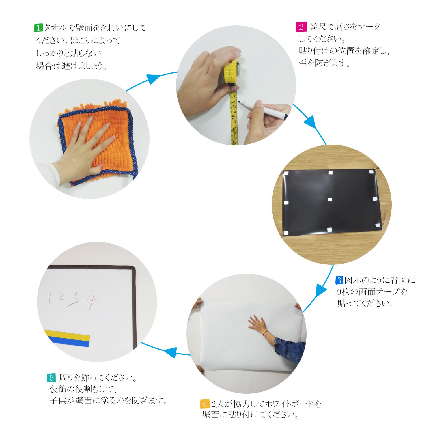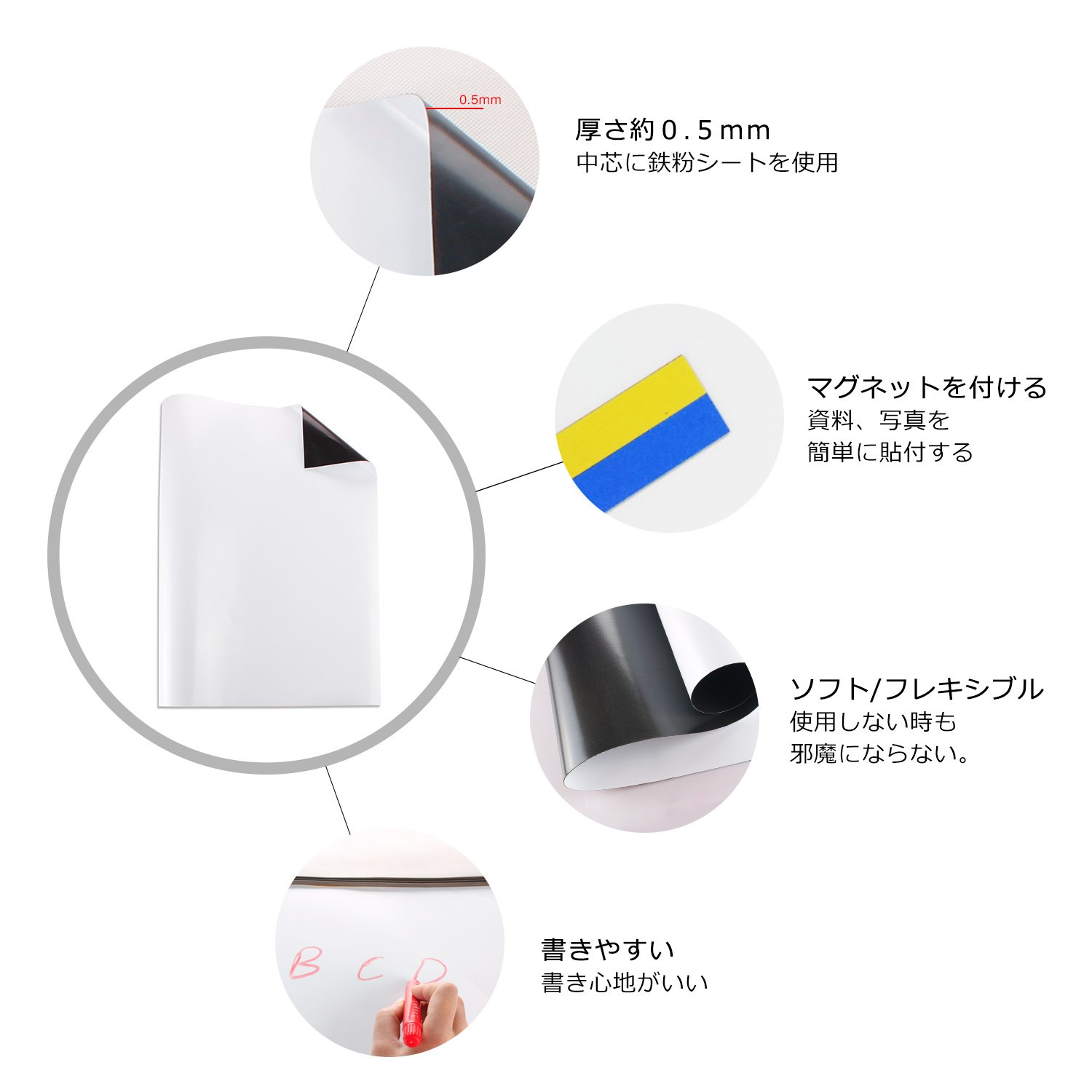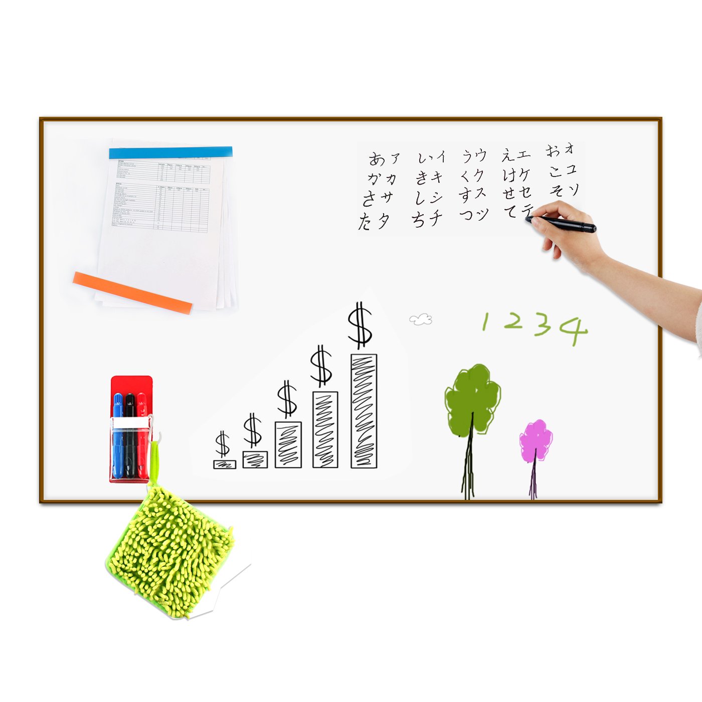 【滑らない&反射しにくい】このホワイトボードは平面ではなくて、粗い表面です。粗い表面は滑らなくて、書きやすいです。または反射しにくいです。2.【環境に優しくて安全!】環境保護の材料を採用し、無毒無害、子供でも使える。特殊コーティングにより油分や水分に強く、長期間の持ちの良さと耐久力があり、壊れ難く使用寿命が長いです。取り外す時、移動の接着剤、破損とか、壁に殘留とかないです。