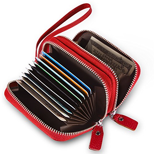 -. Feature : STAY PROTECTED - All credit cards, payment cards, and driver's licenses using RFID chip. Personal data is vulnerable to theft by pickpockets using RFID, NFC scanners within 2 meters. Protect yourself in public places with this RFID blocking wallet. / STYLISH DESIGN - Accordion style for easy organization and retrieval of cards. Removable wrist strap for easy carrying. Heavy duty zipper and Finest Craftsmanship brightens up the wallet. / HIGH QUALITY - 100% Premium Genuine Leather with smooth embossed pebble texture, will endure the wear and tear of everyday use for years. / LARGE CAPACITY - 2 Zippered Compartments: 11 Credit Card Slots, and 2 Cash Slots. Comfortably holds 12-20 cards, some folded cashes, coins, etc. / BUY WITH CONFIDENCE - Please let us know if you not 100% happy with our product, refund or replacement is guaranteed. ORDER NOW AND WE ARE SURE THAT YOU WILL BE SATISFIED!