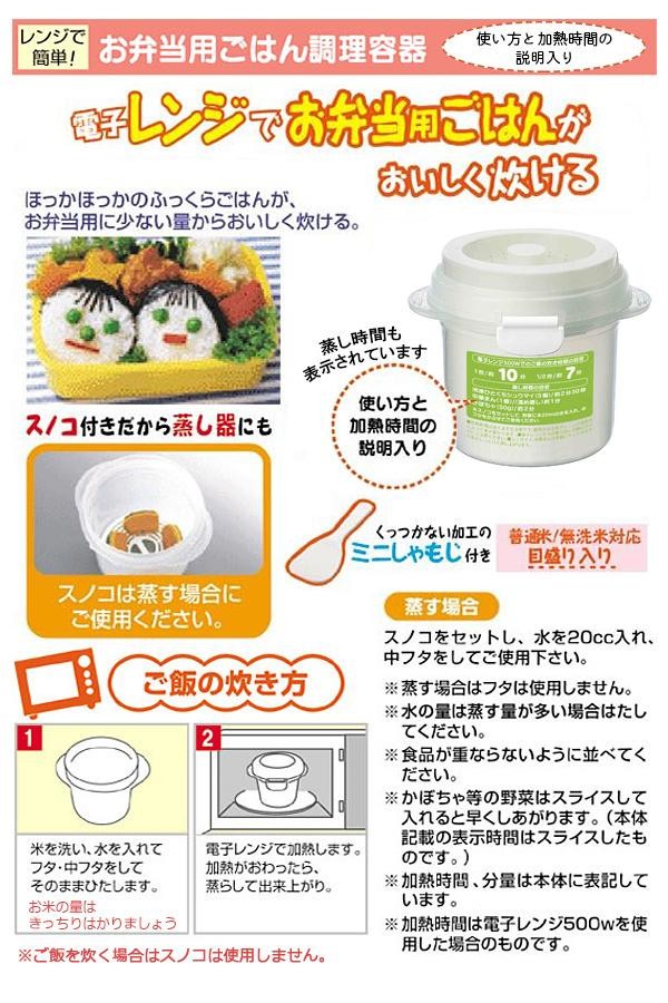 | 電子レンジでふっくらご飯が炊ける調理容器です。スノコが付いているので蒸し料理にも使えます。無洗米・普通米用の水量目盛り入り。忙しいお母さんや、炊飯器を持っていない一人暮らしの方にオススメです♪くっつかない加工のミニしゃもじ付き!! |