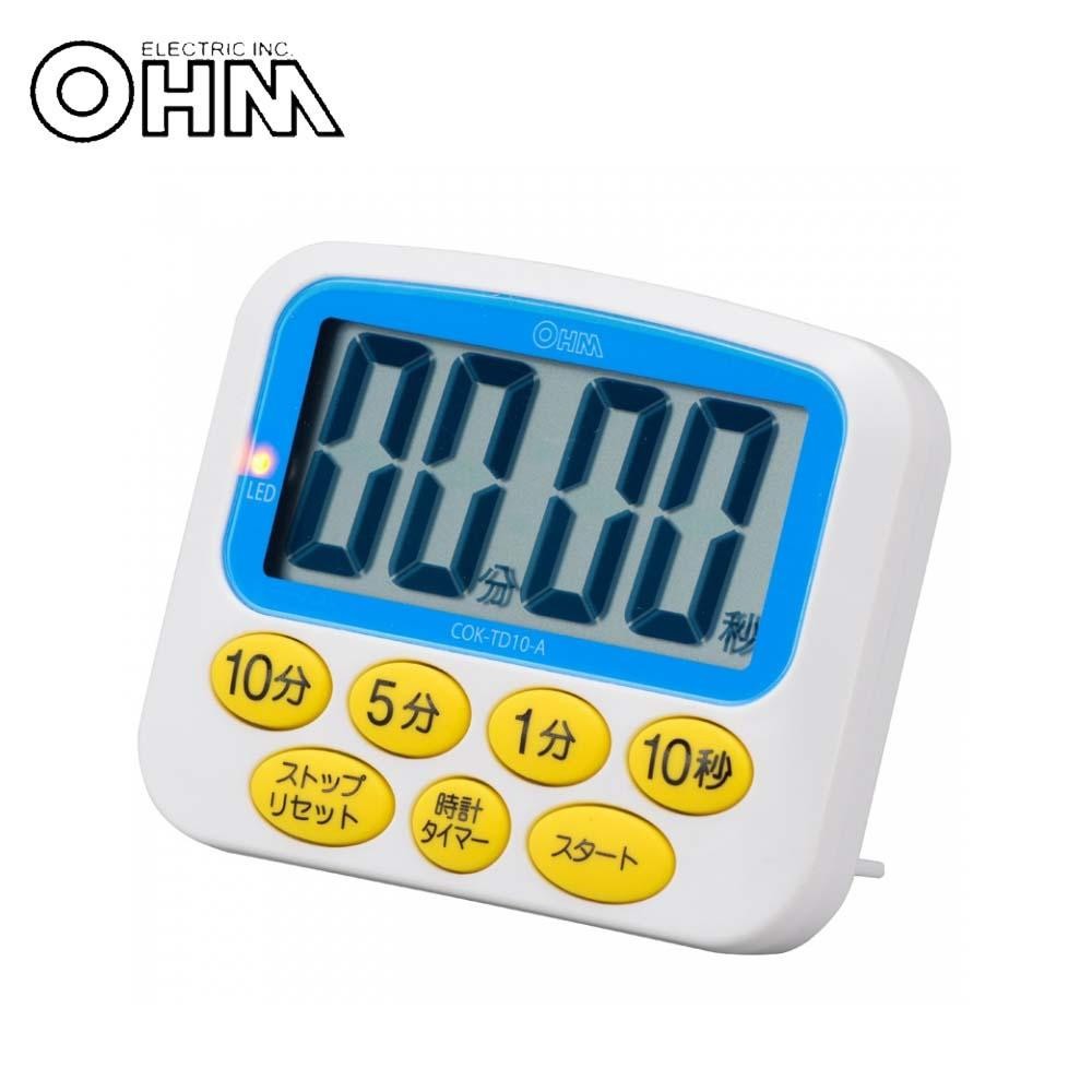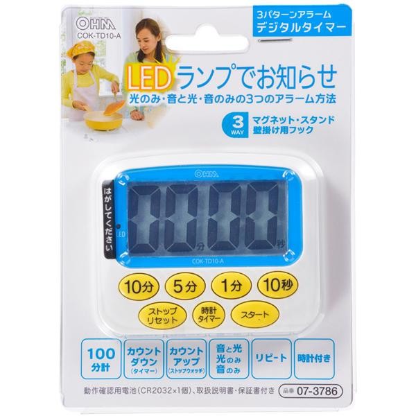 タイマー設定時間を過ぎると自動的にカウントアップが始まります。音と光・光のみ・音のみの3パターンが選べます。 生産国:中国 ※サプライヤー直送品 ご注文後2~3営業日後の出荷となります【商品名】OHM 3パターンアラーム デジタルタイマー ブルー COK-TD10-A