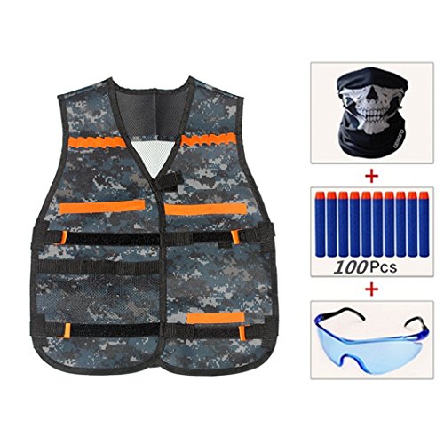 ENNRUI Kids Camouflage Tactical Vest Jacket Kit (with 100pcs Blue Foam Darts + Protective Goggles Glasses + Seamless Skull Face Mask ) for Nerf Toy Gun N-strike Elite Series