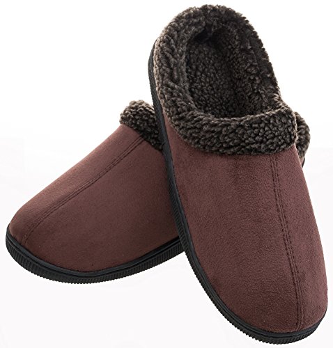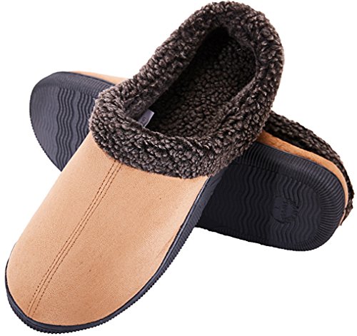 You'll never want to take it off because: * The insole in this slipper is constructed from 3 layers of memory foam and sponge. The top layer is high-density memory foam which offers a steady, elastic and comfortable foot feeling. The bottom 2 layers are sponge. This design will help provide cushioned and supported steps so that you can walk comfortably from room to room. * It can be worn indoors while lounging around and outdoors when collecting the mail or picking up the newspaper with the non-slip side-seamed waterproof outsole. * The attractive plush fleece and faux suede upper fabric will keep your feet warm and comfortable all year long. You will feel like you are walking on a cloud with these lightweight slippers. * The deep toe box design allows the foot to relax and spread out naturally for added comfort.