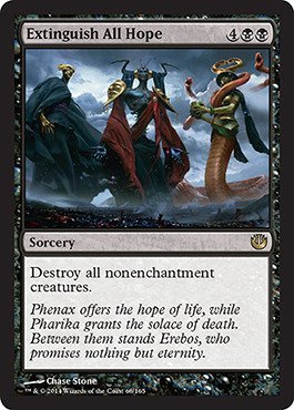 -. Binding : Toy -. Brand : Magic: the Gathering -. EAN : 0744424041606 -. Feature : Magic: the Gathering - Extinguish All Hope (66/165) - Journey into Nyx - Foil / Black -. Label : Wizards of the Coast -. Manufacturer : Wizards of the Coast -. MPN : 4041606 -. PackageQuantity : 1 -. PartNumber : 4041606 -. ProductGroup : Toy -. ProductTypeName : TOYS_AND_GAMES -. Publisher : Wizards of the Coast -. Studio : Wizards of the Coast -. Title : Magic: the Gathering - Extinguish All Hope (66/165) - Journey into Nyx - Foil by Magic: the Gathering -. UPC : 744424041606