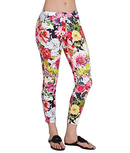 Hue floral luster twill skimmer leggings feature cotton rich twill fabric with a delicate texture, good stretch and a luster finish. These ultra modern leggings feature a subtle sheen on a feminine floral design. Functional back pockets, faux front scoop pockets and fly. Inseam 26.5 inchFeature