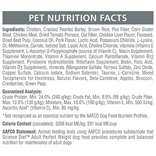 -. Binding : Misc. -. Brand : Hill's Science Diet -. Feature : Chicken is the first ingredient / More than 70% of dogs fed this diet lost weight within 10 weeks / Healthy weight adds to quality of life & life expectancy / Prebiotic fibers for gentle digestion / 100% precisely balanced nutrition -. Label : Hill's Pet Nutrition, Inc. -. Manufacturer : Hill's Pet Nutrition, Inc. -. Model : HLL-536-Parent12 -. MPN : HLL-536-Parent12 -. PackageQuantity : 1 -. PartNumber : HLL-536-Parent12 -. ProductGroup : Pet Products -. ProductTypeName : PET_SUPPLIES -. Publisher : Hill's Pet Nutrition, Inc. -. Studio : Hill's Pet Nutrition, Inc. -. Title : Hill's Science Diet Perfect Weight Dry Dog Food