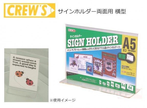 案内板として、メニューやアピールしたい印刷物などをきれいに見せる横型のサインホルダーです。店頭陳列商品のプライスカード・POPカード・商品PRカード・簡単な説明書などを入れることができます。コーヒーショップチェーン店や家具雑貨店・各種ショップでのレジ横の案内板としてもお使いいただいております。プロモーション毎にお使いいただけるように、低価格に設定しております。 |