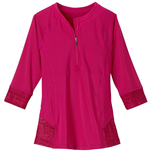 The prAna brigitte sun top adds fashionable feminine style to Ocean performance. Stretch material that's UPF rated for sun protection features crochet detail and flattering princess seaming. A 3/4 sleeve and front 1/2 zip transition from cold to warm water season.Feature