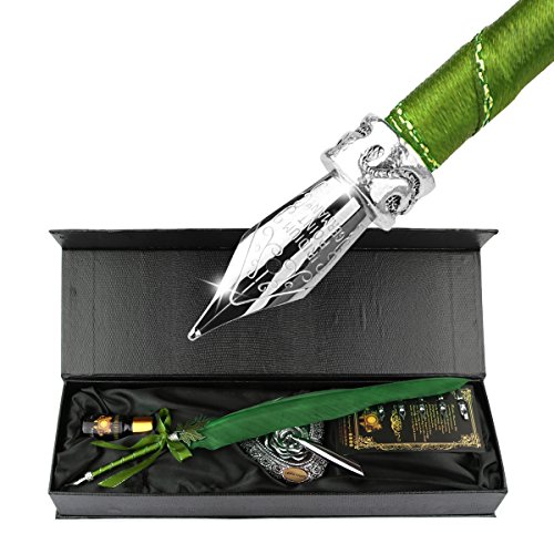 -. Title : Lemonbest Vintage Writing Quill Feather Pen, Antique True Feather Metal Calligraphy Pen, Feather Dip Pen Set with Elegant Carving Pen Stand Ink Bottle 5pcs Nibs (Green)