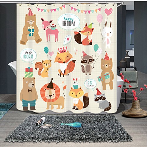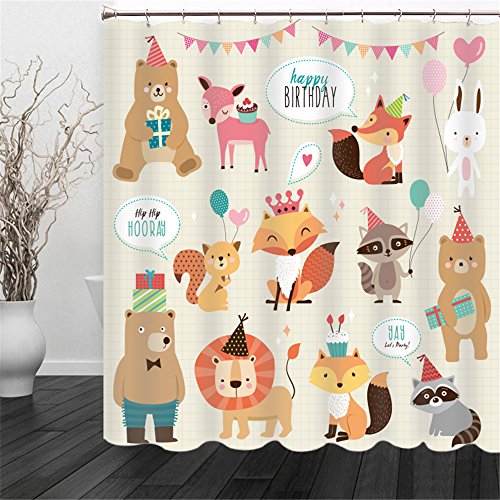 "Happy birthday little fox"Cartoon Shower Curtain for Children Baby,Waterproof and Mildew Resistant Polyester Fabric Shower Curtain with C Hooks 72inch