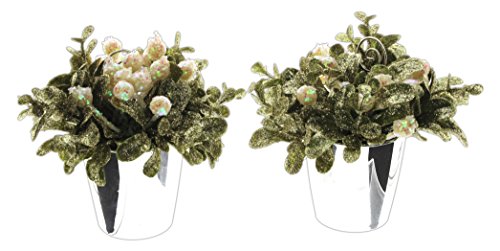 - Glitter-covered plastic leaves in a hard plastic, silver-tone pot