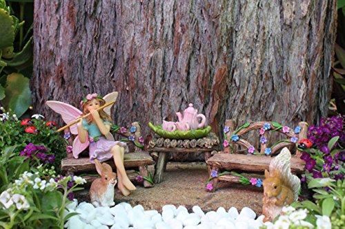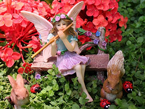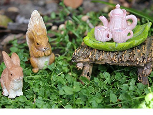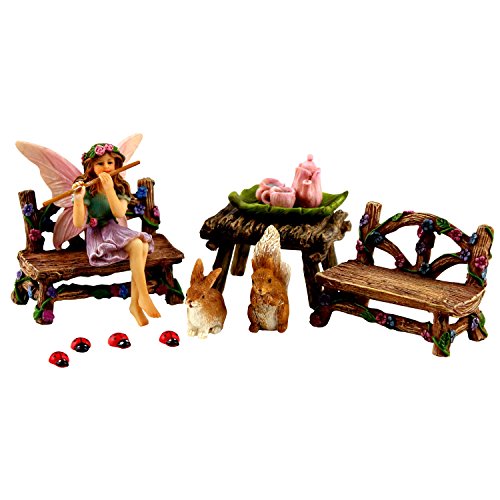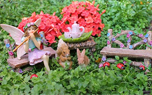 - FAIRY GARDEN ACCESSORIES: Bella, the fairy figurine, is about 2.5" High. The set also includes a Tea Set, 4 x Ladybugs and the fairy garden animals, a bunny and squirrel.