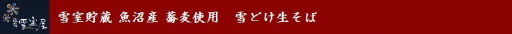 ![]() | ![]() 日本海、連なる山脈、田園を潤す大河。食の宝庫、豊かな自然に恵まれた新潟。雪国が育んだ良質なそばを雪の恵みでさらに美味しく。 雪どけ水が育んだ玄そばを雪室貯蔵。こだわりの玄そばを雪室でじっくり眠らせ、まろやかで味わい深く仕上げました。 ふのりそばは、魚沼に伝わるつなぎに布海苔を使用したそば。そば茶は昔ながらの丸粒製法を使用。 ![]() |