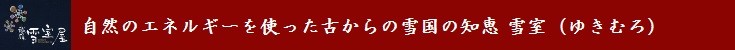 ![]() | 雪室とは、その名のとおり「雪の部屋」という意味です。 雪国では冬に積もった雪を「雪室」に貯め、一年中とけない天然の冷蔵庫として活用してきました。時には厄介者となる雪を「利雪=雪を利用し、共存する」という考え方で発展してきた雪国古来の生活の知恵なのです。 新潟の豪雪地域では現在でも多くの雪室があり、食品貯蔵だけでなく、夏には冷気を室内に送るなど建物の冷熱システムとしても活用されています。 電気や石油の使用量を減らし、CO2の削減にもつながるクリーンエネルギーとして新たに見直され、世界から注目されはじめてきています。 |