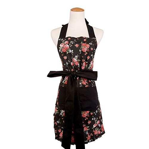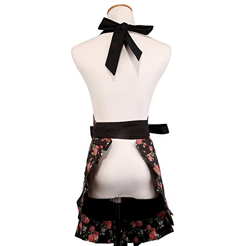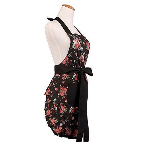 New Classic Retro Style Cotton Canvas Woman Apron, Women's Cooking or Baking Apron, Kitchen Aprons with One Practical Front Pocket (Black Ground with Red Flower)