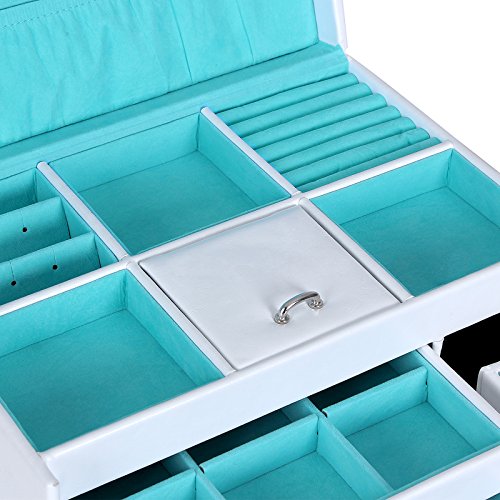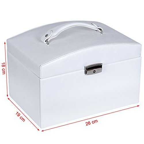 -. Feature : Hochwertige Verarbeitung - Aus mitteldichter Holzfaserplatte (MDF) angefertigt und mit hochwertigem Kunstleder überzogen ist dieser Schmuckkasten stabil und strapazierfähig. Innen mit hochwertigem Samt ausgekleidet, fühlt sich weich an / Perfekte Details - Maße: 26 x 19 x 18 cm; Maße Spiegel: 16,5 x 7,5 cm; Maße des oberen Faches: 8 x 7,5 cm (6x); Maße oben: 26 x 16 cm;Maße Schublade (oben): 17,5 x 16,5 x 2,5 cm; Maße Schublade (unten): 17,5 x 16,5 x 5,5 cm / Viel Stauraum - Durch praktische Verteilung bietet der Kasten verschiedene Ablagemöglichkeit für Ringe, Armbänder, Ketten und vieles mehr. Es gibt ausreichend Platz für unterschiedliche Schmuckstücke. Alles ist an seinem Platz - ordentlich und platzsparend / Klassisches Design - Mit Spiegel im Deckel sieht der Kasten sehr schön und edel aus. Mit praktischem Tragegriff lässt er sich leicht transportieren. Alles bleibt immer griffbereit, was auch das Wiederfinden erleichtert / Hohe Funktionalität - Perfekt für den persönlichen Gebrauch und geschäftliche Nutzung. Deckel ist abschließbar mit Schloss mittels Mechanik. 2 Schlüssel sind dabei. Der praktische Schmuckkasten schützt Ihre Schmuckstücke vor Staub und Kratzern