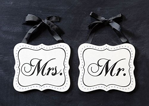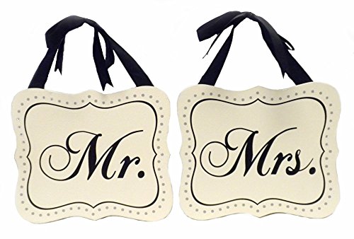 Give a gift of enduring love with this set of two Mr. and Mrs. wooden plaques. The signs can be attached to the back of the wedding couple's chairs, door handles, fence posts, etc. Plaques feature a lightly distressed cream finish, calligraphy script and black ribbon hangers for easy mounting. Each measures 7.5 inches wide x 6.5 inches high. These lovely wall plaques make great wedding decorations and gifts!