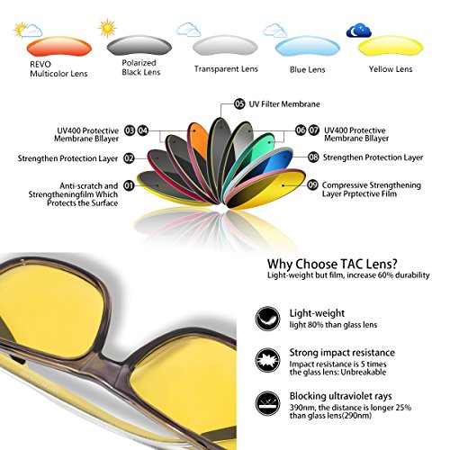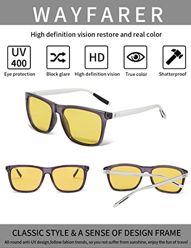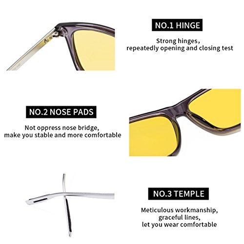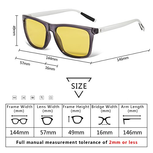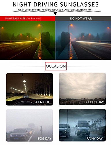 - POLARIZED YELLOW LENSES – Provide reduced glare for clearer vision while driving, designed to dim oncoming car headlights or sharp reflections.The night glasses will enhance retina protection, keep you eye healthy and clear. And the lenses are scratch-proof, shatterproof.