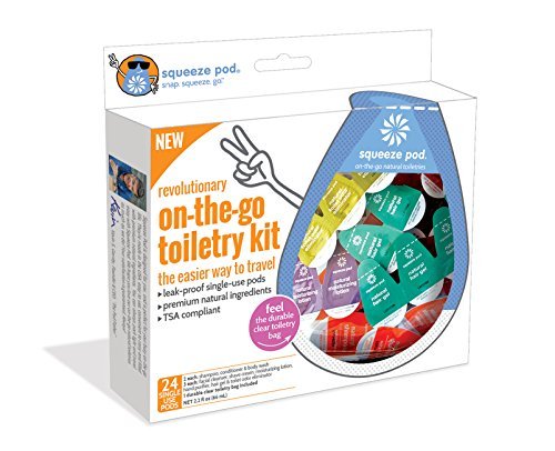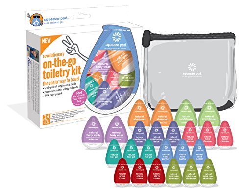 -. Feature : CONTENTS: 24 Single-Use pods. Kit Includes 2 Single-Use Pods of Color-Safe & Sulfate-Free Shampoo, Conditioner and Body Wash and 3 Single-Use Pods of Facial Cleanser, Shave Cream, Moisturizing Lotion, Hand Purifier, Hair Gel, and Toilet Odor Eliminator. Also comes with clear, quart size, TSA-Compliant travel bag. / PREMIUM NATURAL INGREDIENTS - NO sulfates (color-safe), parabens, phthalates or phosphates / LEAK-PROOF GUARANTEE - If it leaks, it is FREE! We will replace your product free of charge / TSA-APPROVED - Makes traveling stress free and meets requirements of TSA carry-on rules. / MADE IN USA. PETA Certified Cruelty Free and Vegan