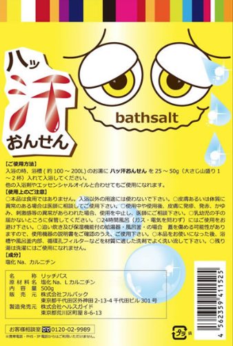 -. Feature : 汗をかきたいな~と思ったら リッチバス 浴用化粧品 / 内容量:500g(1袋10~20回分) / 原材料名:塩化Na、Lカルニチン / ご使用方法:入浴の時、浴槽(約100~200L)のお湯に ハッ汗おんせん を25~50g(大さじ山盛り1~2杯)入れて入浴してください。他の入浴剤やエッセンシャルオイルと合わせてもご使用になれます。 / 販売元:株式会社フルバック