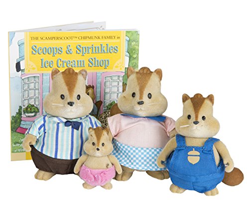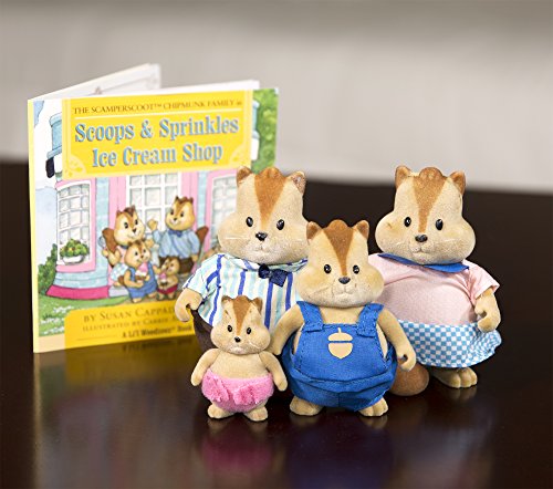 -. Binding : Toy -. Brand : Li'l Woodzeez -. Feature : SCAMPERSCOOT FAMILY OF FOUR: Father Chewey, mother Marigold, and their children Snap and Peanut run the local ice cream shop in Honeysuckle Hollow, the charming critter town where all the woodland creatures work together to take care of each other and their environment. / COMES WITH STORYBOOK: The Scamperscoots are wondering if customers are tired of the same three kinds of ice cream: chocolate, vanilla, and strawberry. They need to come up with a new and exciting flavor at their ice cream shop, but there are so many delicious ideas from their friends to choose from! / EASY AND INTERACTIVE TOYS: Li'l Woodzeez toys don't require batteries and are ready to play right out of the box. For cleaning, just wipe clean with a damp cloth. / PART OF THE LI'L WOODZEEZ WORLD: Like all Li'l Woodzeez friends in Honeysuckle Hollow, this playset can be combined with other Li'l Woodzeez characters for added fun and larger creative worlds. / NOT TOO BIG, NOT TOO SMALL: Package includes (4) Li'l Woodzeez characters and a bonus storybook, "Scoops & Sprinkles Ice Cream Shop." It's small enough to store, big enough for little hands, and sturdy enough for hours or years of play. For ages 3 and up. -. IsAdultProduct : 0 -. Label : Battat -. Manufacturer : Battat -. ProductGroup : Toy -. ProductTypeName : TOYS_AND_GAMES -. Publisher : Battat -. Studio : Battat -. Title : Li'l Woodzeez Scamperscoot Chipmunk Family 4-Piece Storytime Play Set with Storybook
