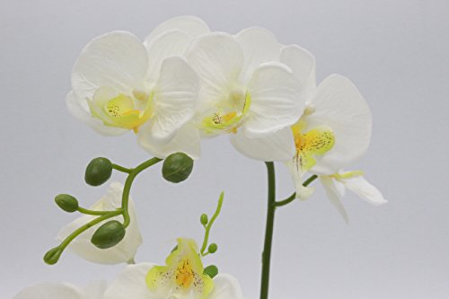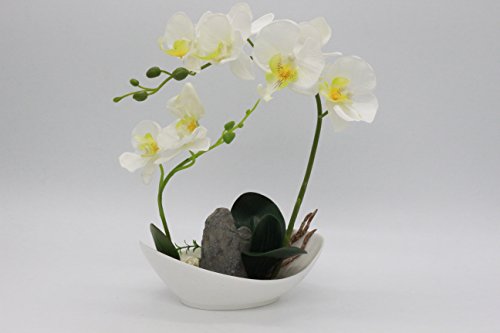 MODERN DESIGN AND LIFELIKE TOUCH - Modern design and life-like arrangement add elegance to any room or tabletop without the upkeep. Beautiful artificial silk orchids Phalaenopsis Bonsai and green leaves with stylish white plastic vase.