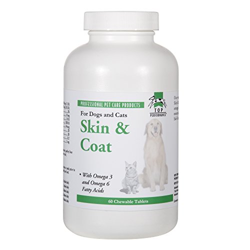 Top Performance Skin & Coat Tablets feature omega 3 and omega 6 as well as added vitamins that are essential for skin health. • Highly palatable • Natural chicken and beef flavor Top Performance Skin & Coat Tablets are available in 60-count bottles. GUARANTEED ANALYSIS: *Omega 6: 2.9% Min. *Omega 3: 1.0 % Min. Calcium: 3.3% Min. Zinc: 5 mg Vitamin E: 20 IU Vitamin A: 28 IU Vitamin B1: 50 mcg Vitamin B2: 20 mcg Vitamin B6: 30 mcg Vitamin B12: 2 mcg (All values are minimum unless otherwise noted) *Not recognized as an essential nutrient by the AAFCO Dog Food Nutrient Profiles Ingredients: Natural flavoring, dicalcium phosphate, powdered cellulose, dextrates, sunflower oil powder, maltodextrin, stearic acid, microcrystalline cellulose, fish oil powder, silicon dioxide, d-tocopheryl acetate, zinc citrate, cobalamin, vitamin A palmitate, thiamine mononitrate, pyridoxine hydrochloride, riboflavin powder Directions for use: For best results, use daily. Administer as a treat or snack prior to feeding. May also be crumbled and mixed with pet food. Dosage: • Small dogs & cats (5-20 lbs.): ½ tablet daily • Mid-size dogs (21-50 lbs.): 1 tablet daily • Large dogs (51-80 lbs.): 2 tablets daily • Very large dogs (81-110 lbs.): 3 tablets daily • Giant breed dogs (over 110 lbs.): 4-5 tablets dailyFeature