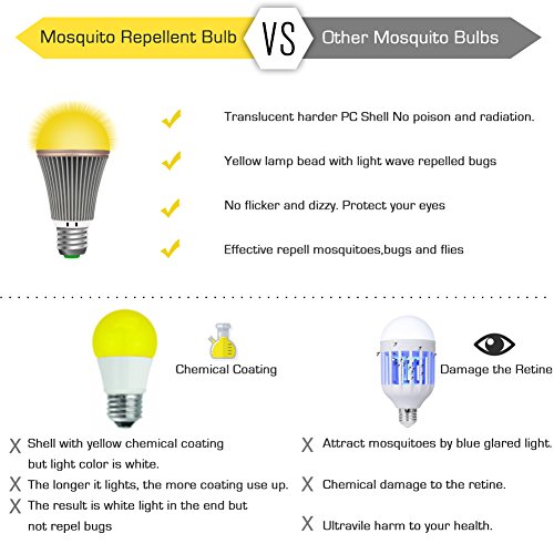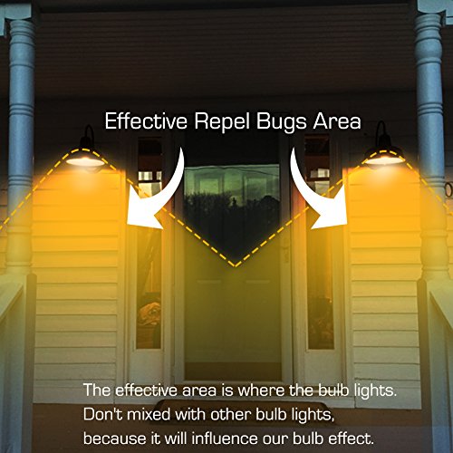 Safety for You Our LED light effectively repel bugs mosquitoes etc by warm yellow light but not attract and then kill them by glared light as other bulbs. You do not need clean the bodies of mosquitoes because you will not see them anymore.