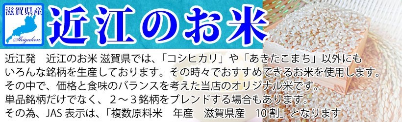 【近江のお米(滋賀県産100%)近江発 近江のお米】滋賀県では、「コシヒカリ」や「あきたこまち」以外にもいろんな銘柄を生産しております。その時々でおすすめできるお米を使用します。その中で、価格と食味のバランスを考えた当店のオリジナル米です。単品銘柄だけでなく、2~3銘柄をブレンドする場合もあります。その為、JAS表示は、「複数原料米 年産 滋賀県産 10割」となります。※分搗き精米商品は、精米方法により目減りいたします。