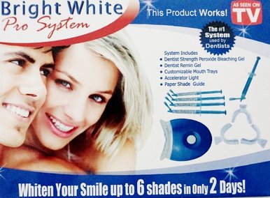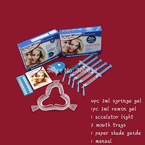 -. Feature : Spa Series Bright White Professional Teeth Whitening System Includes Everything You Need For a Bright, Beautiful, White Smile / System Includes: 4 Dentist 35% Strength Carbamide Peroxide Teeth Whitening Gels, 3 Customizable Teeth Whitening Trays With Insructions, 1 Dentist Remineralization Gel, 1 Blue Accelerator Light, Teeth Shade Guide and Instructions / The #1 System Used By Dentists! Whiten Your Smile Up To 6 Shades in Only 2 Days! / Fast and Effective Proven Results. Safe and Simple to Use. / As Always 100% Satisfaction Guaranteed. If you are not satisfied with the product simply return it for a refund.