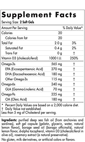 Complete Omega-D3 provides full-spectrum essential fatty acid support that blends omega-3s EPA and DHA from fish oil for a healthy heart, normal brain function, and a positive mood, with omega-6 GLA from borage oil for healthy joints and skin, and omega-9. To this, we’ve added 1000 I.U. natural vitamin D3 for enhanced bone, immune, and mood health.