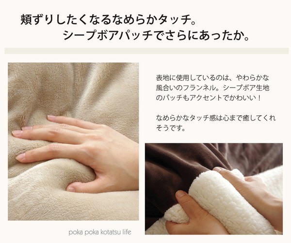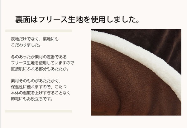 無地のこたつ布団です。表地には柔らかく、肌触りの良いフランネル生地を使用してます。裏地には軽くて保温性の高いフリース生地を使用しています。部分暖房のコタツは電気代もおトクです。また、表地の素材が同じで同色のキルトラグも別途取扱いがありますので、トータルでのコーディネートもおすすめです。
