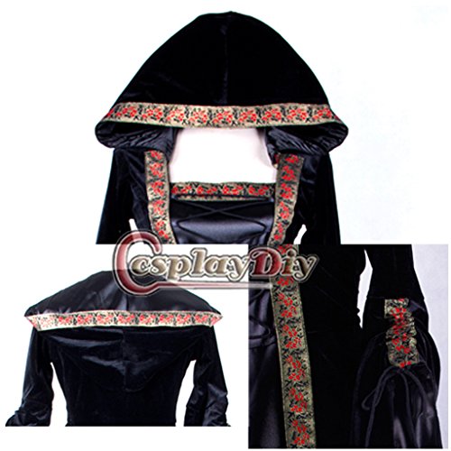 -. Brand : CosplayDiy -. Color : Black -. Department : womens -. Feature : Material:Polyester & Satin / Package including list: 1*CosplayDiy Dress, 1*hooded cape / Hand Wash Recommended / Please email us for any problems and we will reply you within 24 hours / Size Note:Please choose a suitable size from Amazon size chart,or you can leave us your size information about height/shouder/chest/waist/hip/arm for tailor made,if we donot receive any information within 2 days,we will make the custome according to the size you've selected and won't be responsible for any wrong choice. -. ProductGroup : Apparel -. ProductTypeName : ADULT_COSTUME -. Title : CosplayDiy Women's Deluxe Hooded Collar Victorian Dress Costume Black
