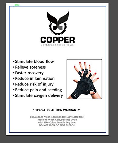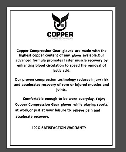 All Copper Compression Gear products come with a 100% SATISFACTION GUARANTEE - We are so confident that you will feel the difference so we want you to try it out completely risk free to see for yourself! Copper stimulates the immune system to fight infections, repair injured tissues and promote healing. Copper Compression Arthritis Gloves have the highest copper concentration available on the market. Compression helps stabilize muscle tissue, keeping the swelling of muscle fibers at a micro level. Compression also increases oxygen blood flow to the muscles to aid recovery while reducing inflammation. Copper Compression Gear Arthritis Gloves are comfortable enough to be worn all day while still providing great support and a nice compression to speed up recovery, inflammation, and soreness of your muscles, joints, and tendons. Many people in their 40's, 50's, and 60's have also raved about these gloves in helping them recover faster and ease the pain of arthritis, tendonitis, inflammation, and other aches and pains. The gloves are also easily washable! Machine wash cold, delicate cycle. Click the "Add To Cart" button on this page to try your Copper Compression Gear Arthritis Gloves completely RISK FREE because you are completely covered by our 100% MONEY BACK GUARANTEE. 0 |