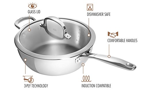 -. Feature : Heat-Radiant aluminum core fused between two layers of stainless steel ensures even cooking from every side / Angled side walls help liquids evaporate quickly and rounded bot facilitate efficient stirring / Unique rolled edges designed for drip free pouring of sauces, reductions and more / Durable, scratch-resistant materials are oven safe up to 430 Degree Fahrenheit and dishwasher safe / Works on all stovetops, including induction
