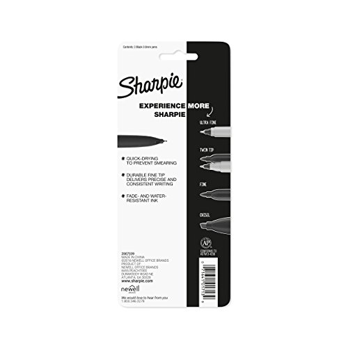 -. Feature : Get the bold, smooth, high-quality writing experience of Sharpie markers with the sharp line of a pen and a cushioned grip that lets you write more easily. / Water- and smear-resistant pens are great for home and school use. / Ink is acid-free and non-toxic. Won't bleed through paper. / Durable fine-point tip produces thinner detailed lines on even hard-to-mark surfaces. Ideal for birthday cards, note taking, and thank-you notes. / Set of 3 Black Ink PensSoft grip along barrel for added writing comfortDelivers the same bold, smooth, high-quality writing experience of the Sharpie marker with the performance of a pen that doesn't bleed through paperDurable fine point tip end / Set of 3 Black Ink Pens / Soft grip along barrel for added writing comfort / Delivers the same bold, smooth, high-quality writing experience of the Sharpie marker with the performance of a pen that doesn't bleed through paper / Durable fine point tip ensures crisp, precise and consistent line-width