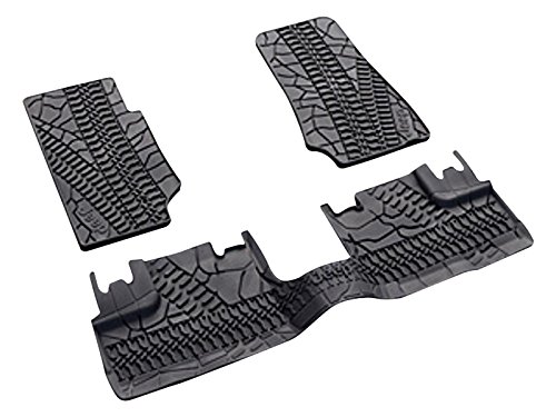 -. Feature : Two front row mats feature Jeep logo and tire tread design / All-weather Floor Mats are TPE rubber molded in Dark Slate Gray / Oversized design with deep ribs to trap and hold water, snow and mud to protect your carpet and keep it clean / Also known as Slush Mats, a must during inclement weather, but work great in all seasons / Deep ribs trap and hold water, snow and mud to protect your carpet and keep it clean / A must during inclement weather / Front and rear (three-piece), Slush Mats, Dark Slate Gray, Jeep logo / 2007-2013 Wrangler 4-Door / Genuine Chrysler Accessories 82210166AD Slush Mats-Front and rear (three-piece), Slush Mats, Dark Slate Gray, Jeep logo